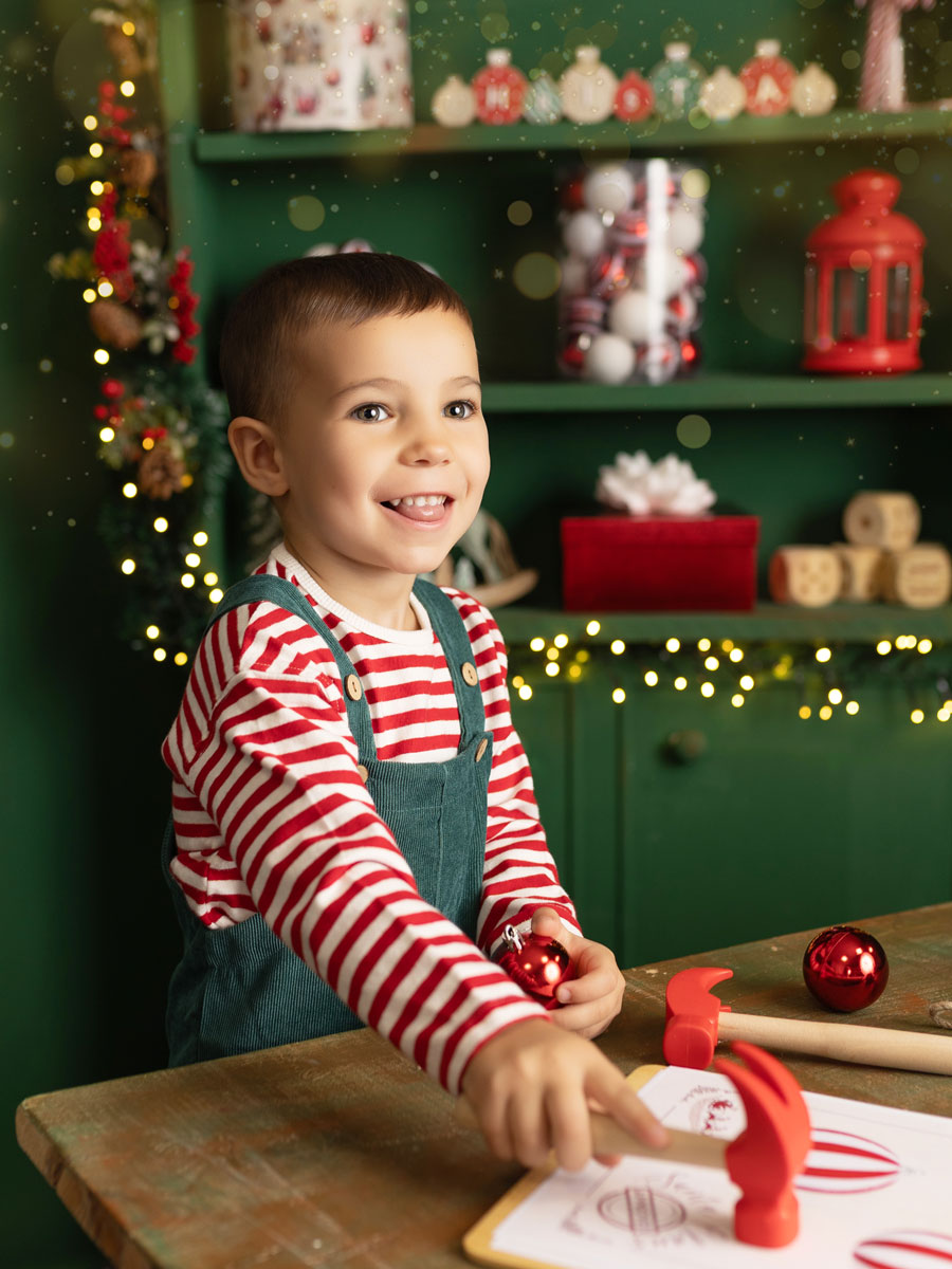 Este año, nuestra campaña de Navidad 2025 te invita a sumergirte en una experiencia única, donde cada sesión captura la esencia más pura de estas fechas tan especiales. Nuestro decorado combina la calidez y tradición de la Navidad con un toque moderno y sofisticado inspirado en un taller navideño. Los colores, las luces cálidas, y los detalles festivos, crean un ambiente perfecto para retratar momentos inolvidables junto a los tuyos.
